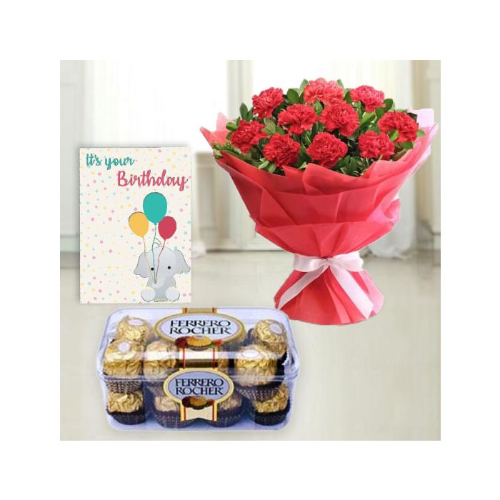 Looking for a gorgeous and unique gift that will make someone's day? Look no further than this incredible bundle! It includes a beautiful bunch of 20 red carnations, 16 delicious Ferrero Rocher chocolates, and a birthday greeting card. This is the perfect present for anyone who loves flowers and chocolate, and it is sure to put a smile on their face. So go ahead and make someone's day with this stunning gift today!