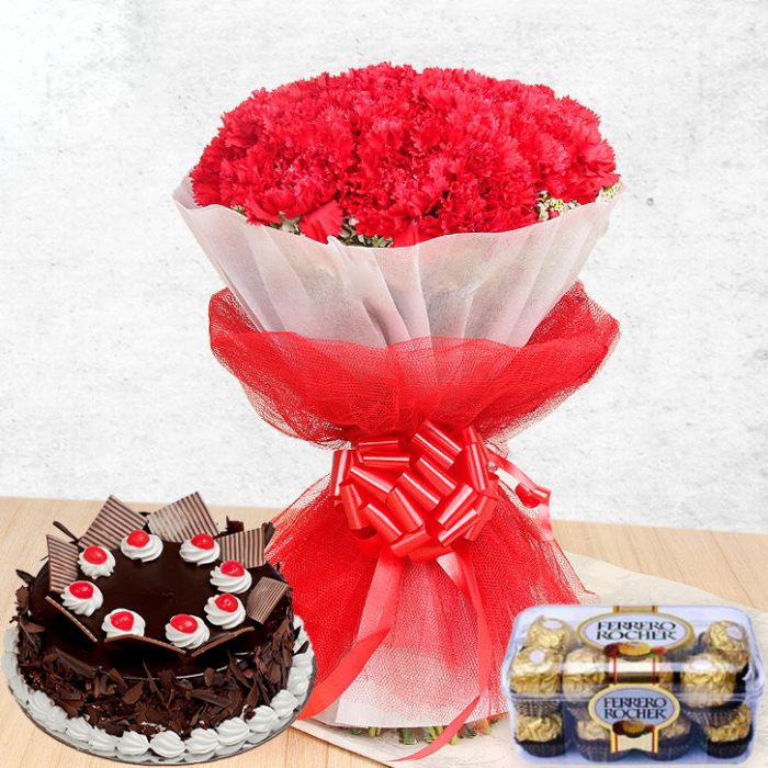 Bunch of 20 Red Carnations with 16 pcs Ferrero Rocher Chocolates with half kg black forest cake