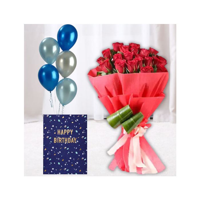 Bunch of 20 red roses ,5 bunch of mix color balloons with birthday card