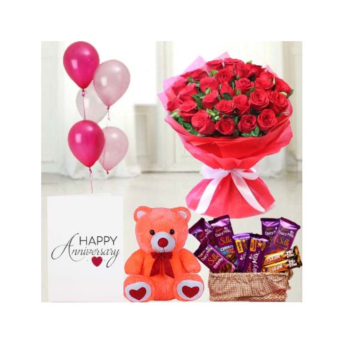 Bunch of 20 red roses, 6 inch teddybear, Basket of 7 dairy milk silk chocolates with 2 Fivestar, anniversary greeting card with 5 blown balloons