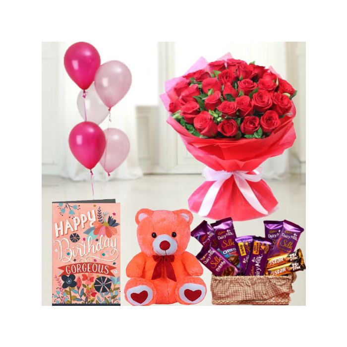 Bunch of 20 red roses, 6 inch teddybear, Basket of 7 dairy milk silk chocolates with 2 Fivestar,birthday greeting card with 5 blown balloons