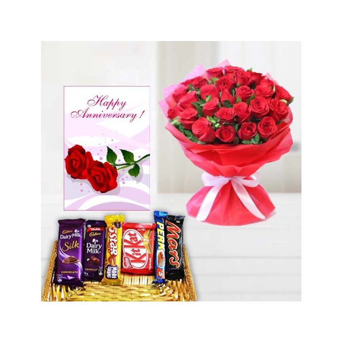 Bunch of 20 red roses, basket of assorted chocolates , anniversary Greeting card