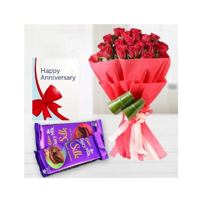 Looking for the perfect anniversary gift? Look no further than this gorgeous bunch of 20 red roses, accompanied by a set of two delicious Dairy Milk Silk chocolates and a beautiful greeting card.Your loved one will be absolutely thrilled with this thoughtful and romantic gesture, and you can be sure that the roses will stay fresh for days to come. Order now and let us help you make this anniversary one to remember!