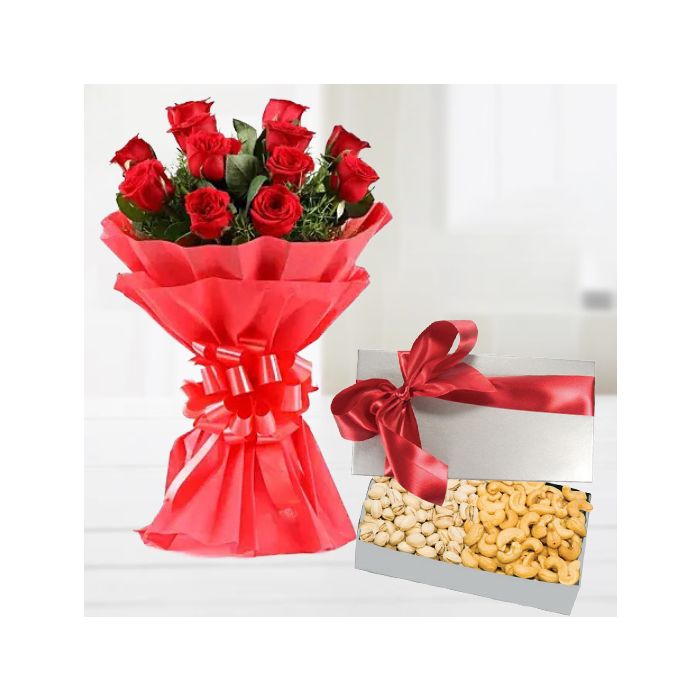 If you are looking for a gift that is sure to impress, then look no further than this stunning bunch of 20 red roses. This beautiful arrangement comes complete with a basket of delicious cashew and pistachio nuts, making it the perfect gift for any occasion.The deep red color of the roses symbolizes love and passion, making this an ideal choice for a romantic gesture. The luxurious basket and tasty nuts add an extra touch of luxury, making this a gift that is sure to be appreciated.