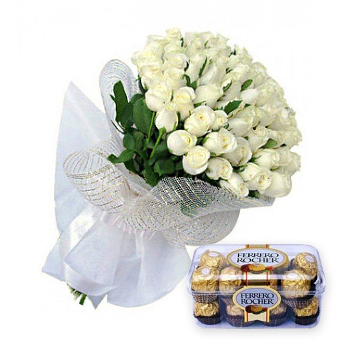 Bunch of 20 white roses with box of 16 pcs ferrero rocher chocolates