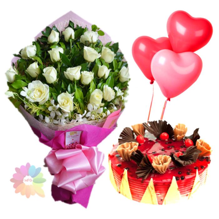 Bunch of 20 white roses with blueberry fresh cream cake with 3 heart shape balloons