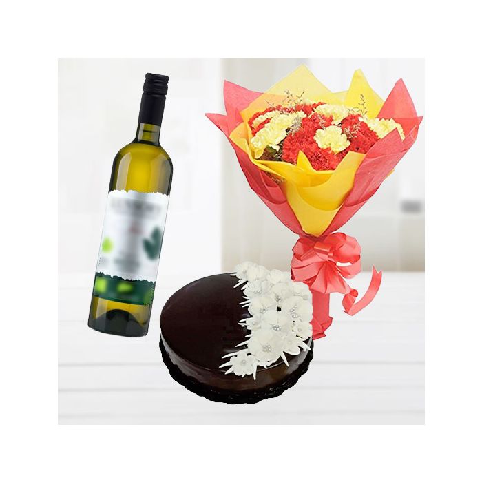 Product Description 5 | Bunch of 24 carnations with chocovanilla cake with bottle of white wine |