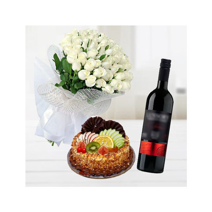 Product Description 5 | Bunch of 30 white roses with blueberry cake with bottle of red wine |