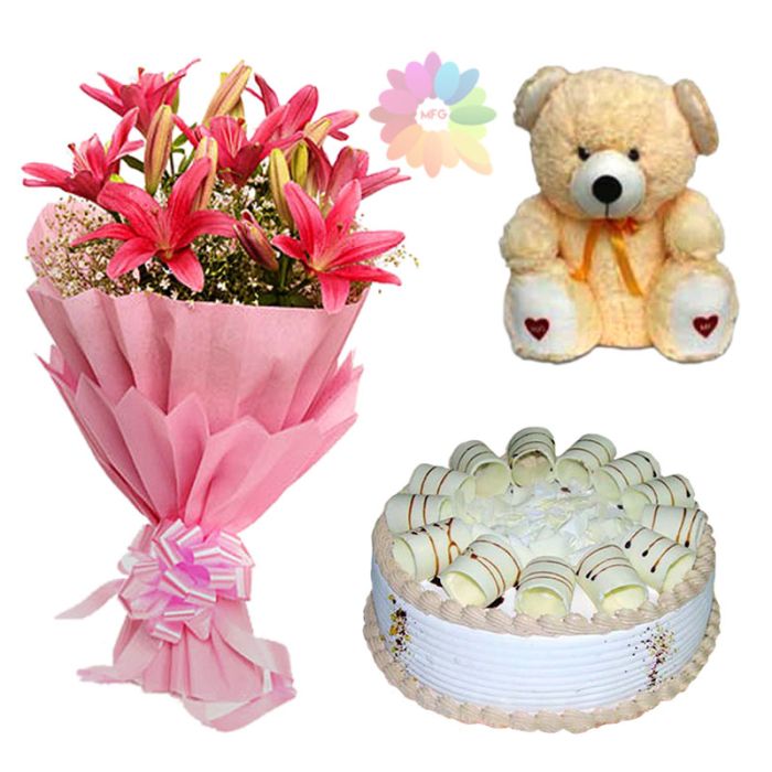 bunch of 5 pink asiatic lilies with choco vanilla cake with 6 inch height teddy bear
