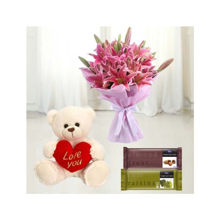 Bunch of 5 pink lilies with set of 2 temptations & 6 inch height teddy bear
