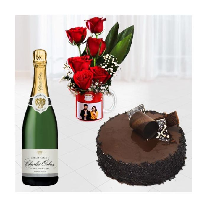 surprise your loved ones with this beautiful bunch of 5 red roses arranged in a photo mug, along with a bottle of champagne and a delicious half kg chocolate chips cake. This is the perfect way to show how much you care and appreciate them. Order now while stocks last!
