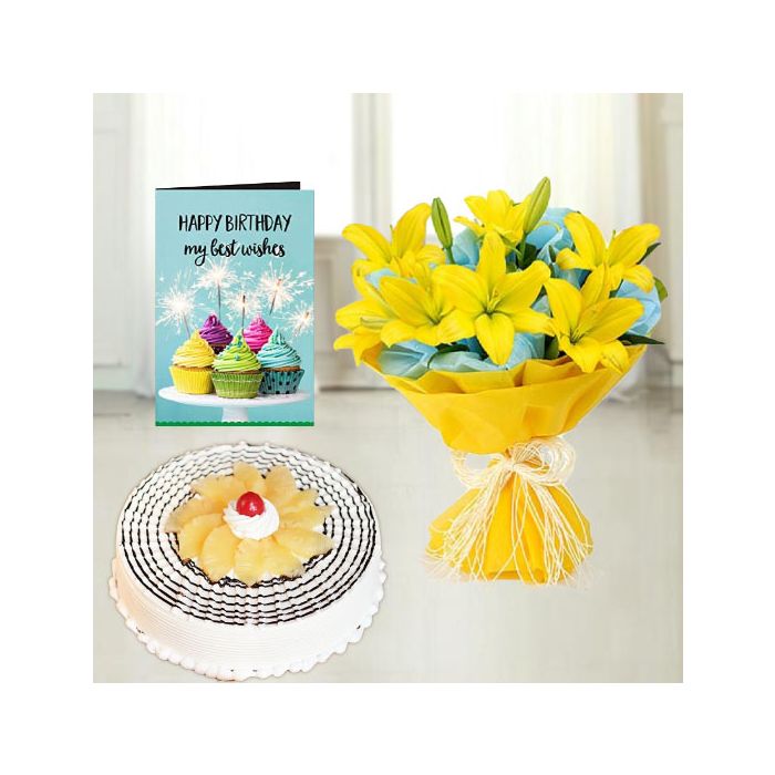 Looking for the perfect way to show someone you care? Our Bunch of 5 yellow lilies, pineapple cool cake, and birthday greeting card is the perfect gift to do just that! Handpicked yellow lilies are known for their ability to brighten anyone's day, making this bunch the perfect way to show your loved ones how much you care. The pineapple cool cake is sure to be a hit with its delicious flavor and moist texture. The birthday greeting card is a great way to personalize your gift and show them how much you care on their special day.