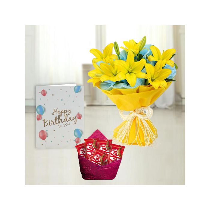 Bunch of 5 yellow lilies , pack of 5 kitkat chocolates, birthday Greeting card