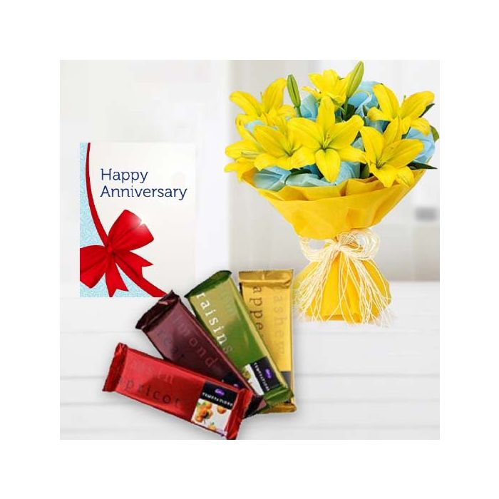 Bunch of 5 yellow lilies , set of 4 bournville chocolates, anniversary Greeting card
