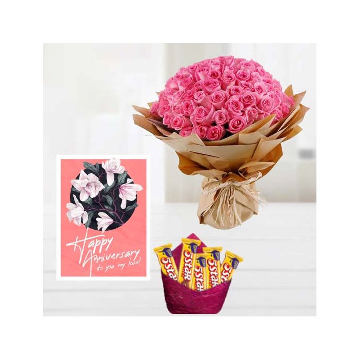 Bunch of 50 pink roses, pack of 5 fivestar chocolates, anniversary greeting card