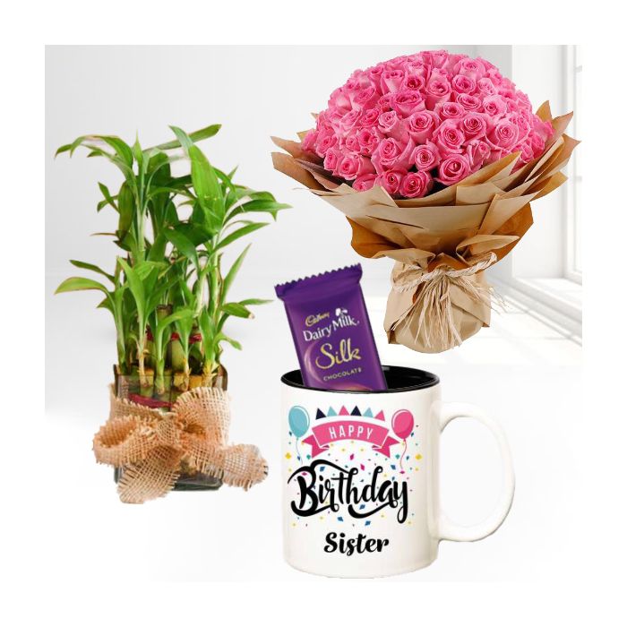 Bunch of 50 pink roses, photo mug lucky bamboo plant with dairy milk silk chocolates