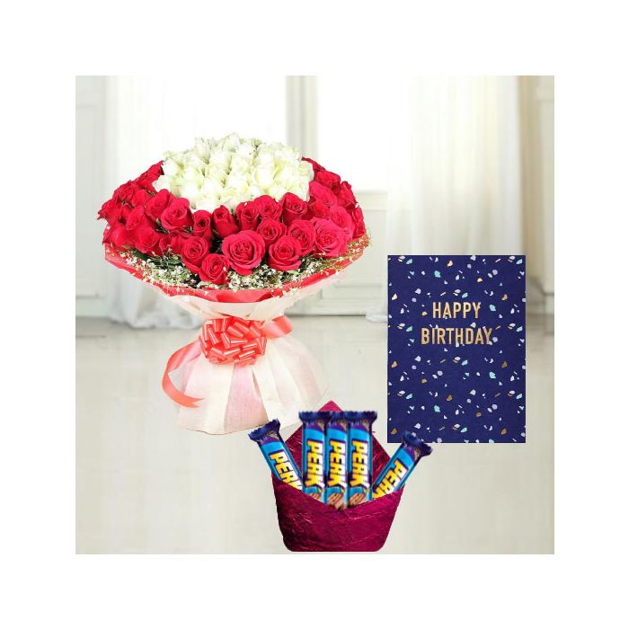 Bunch of 50 red and white roses, pack of 5 perk chocolates, birthday greeting card