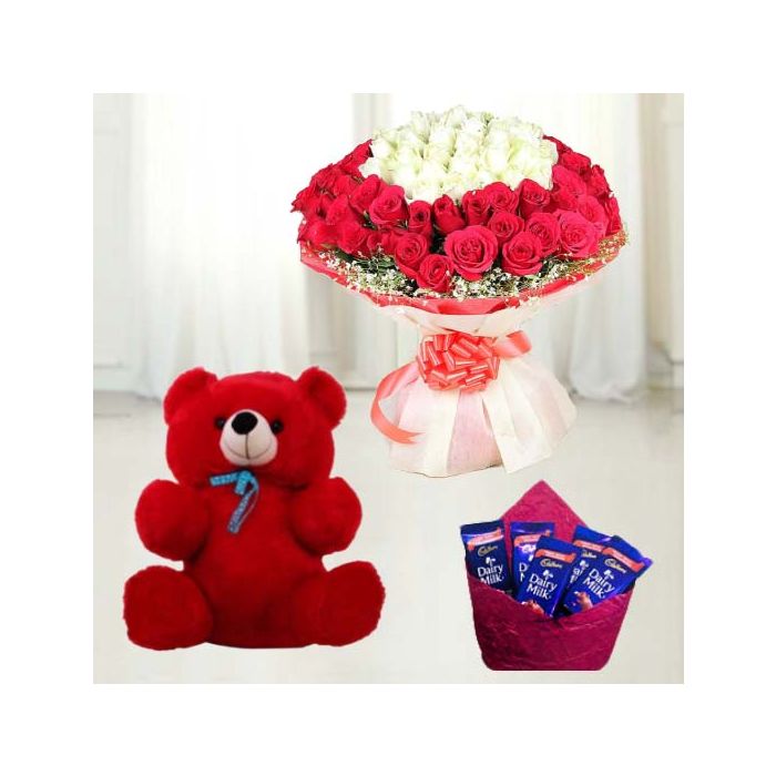 Bunch of 50 red and white roses with 6 inch teddy bear & pack of 5 dairy milk chocolate