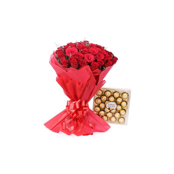 Welcome to our online store! We are excited to offer this special bunch of 50 red roses with special packing and 24 pcs Ferero Rocher chocolate box. This is a great gift for any special occasion, or just to show your loved ones how much you care.The roses are fresh and beautiful, and the chocolates are delicious. This is a perfect way to show your romantic side, or to show your appreciation for someone special. Order today and make someone's day!