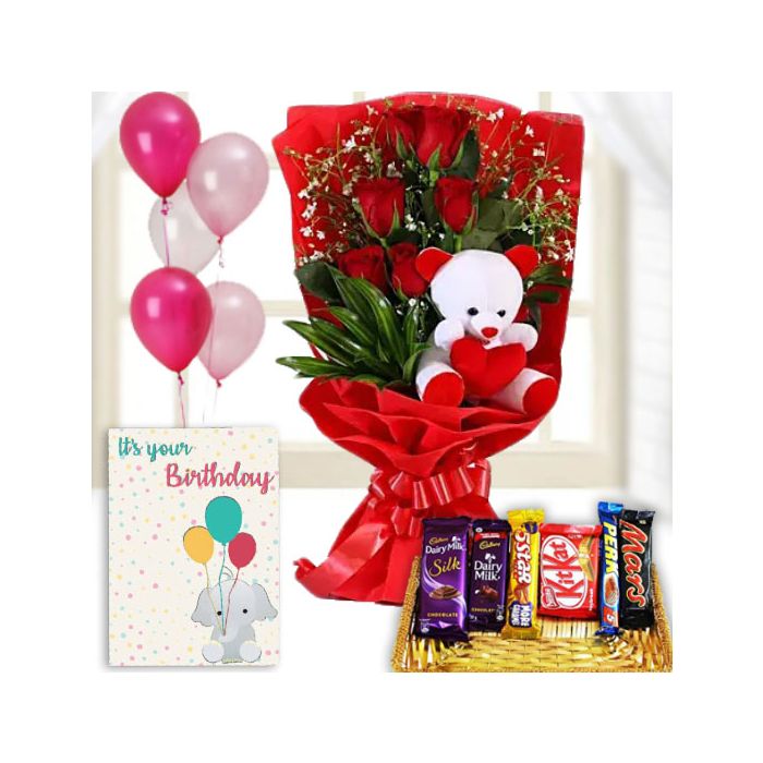 Bunch of 6 red roses with 6 inch teddybear sitting in it , Basket of assorted chocolates, birthday Greeting card with 5 blown balloons