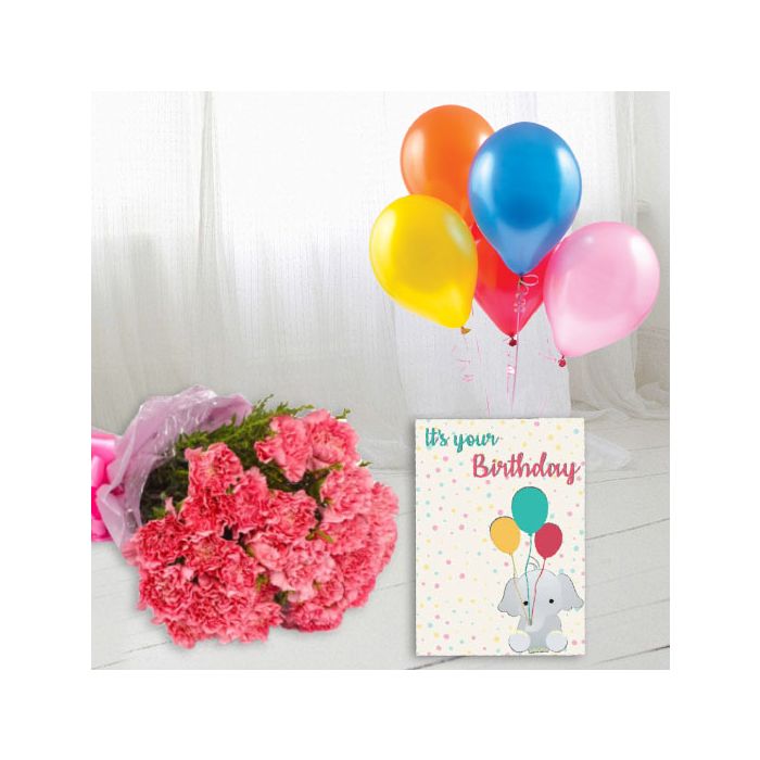 Bunch of 8 pink carnations, 5 bunch of mix color balloons with birthday card