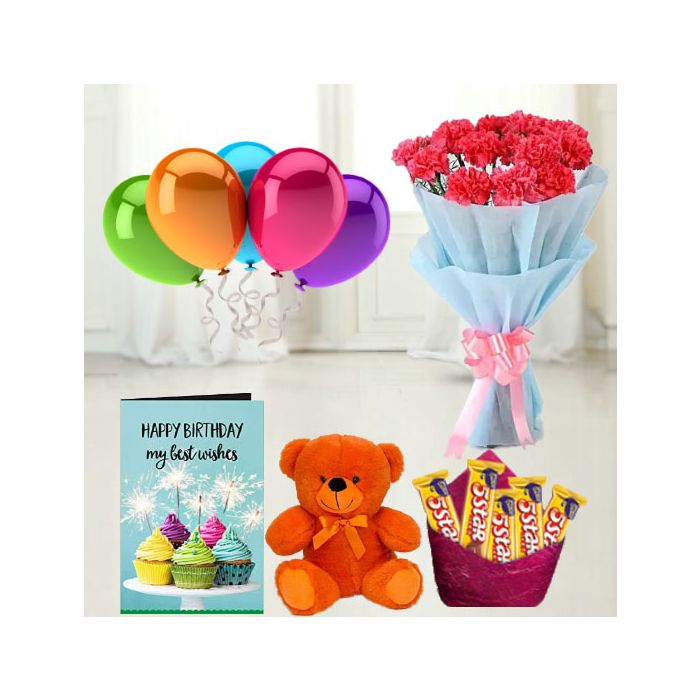Bunch of 8 pink carnations , 6 inch height teddybear , set of 5 fivestar chocolates,birthday greeting card with 5 blown balloons