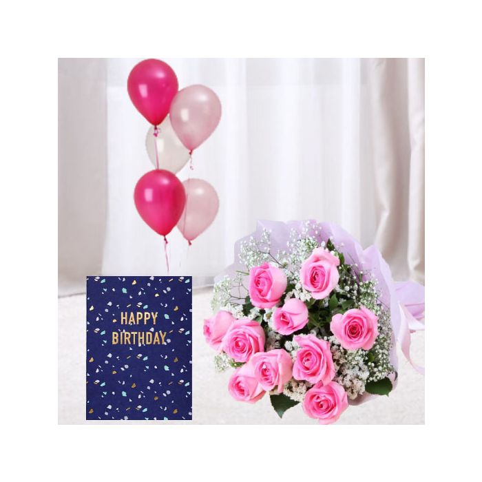 Bunch of 8 pink roses, 5 bunch of mix color balloons with birthday cards