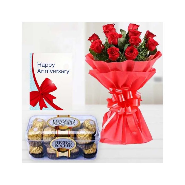 Bunch of 8 red roses, 16 pcs rocher ferrero chocolates, anniversary greeting card