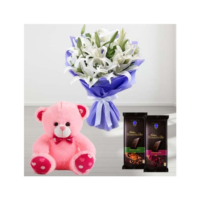 Looking for a gift that is sure to please? Look no further than this gorgeous bunch of 8 white lilies, accompanied by a cute 6 inch teddy bear and delicious set of 2 Bournville dark chocolates. The perfect way to show your loved ones how much you care, this gift is sure to make them smile. Order now for fast, reliable delivery.