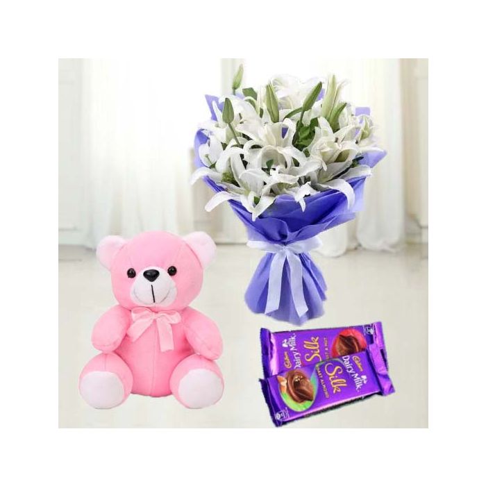 This lovely bunch of 8 white lilies is the perfect gift for any occasion! It comes with a set of 2 Dairy Milk chocolates and a 6 inch teddybear, making it the ultimate gift package! The lilies are beautifully arranged and the chocolates are sure to satisfy any sweet tooth! This package is sure to put a smile on anyones face!