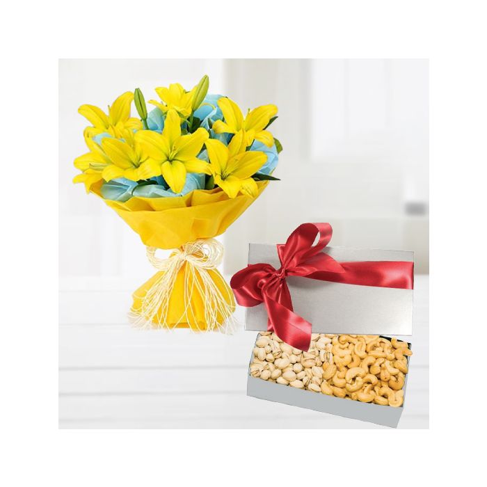 Looking for the perfect way to show your loved ones how much you care? Look no further than this stunning bunch of 8 yellow Asiatic lilies, perfectly arranged in a basket with half a kilo of delicious cashews and almonds. The vibrant yellow flowers are a symbol of joy and happiness, making this the perfect gift for any occasion. Plus, the tasty treats are sure to be enjoyed by all. Order now and make someone smile today!