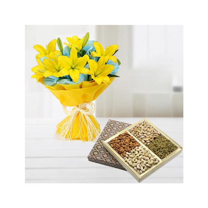 Bunch of 8 yellow lilies with box of half kg assorted dryfruits