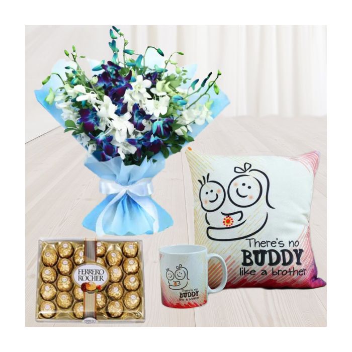 Looking for the perfect way to show your loved ones how much you care? Look no further than this amazing gift bundle! It includes a beautiful bunch of blue and white orchids, 24 delicious Ferrero Rocher chocolates, and a custom photo mug. Plus, we've added a cozy photo cushion, so they can keep your smiling face close by at all times.Whether you're saying "Happy Birthday," "Thinking of You," or simply "I Love You," this gift is sure to make a lasting impression. Order today and make someone's day!