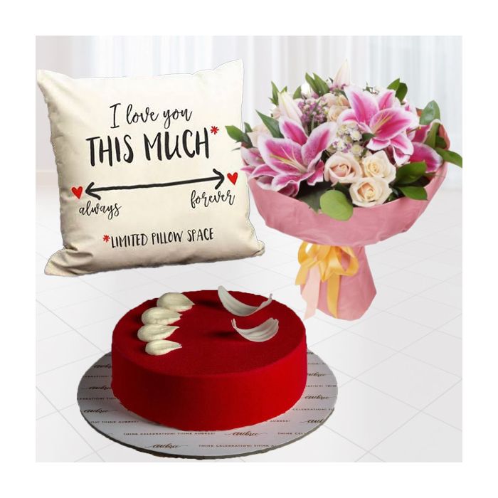 Bunch of exotic mix flowers, half kg red velvet cool cake , photo cushion