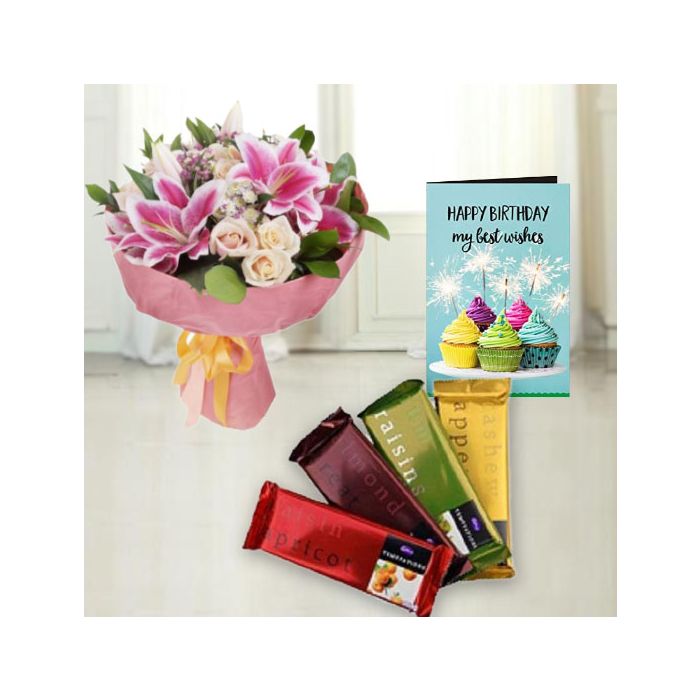 Make someone's day with this beautiful bunch of exotic mix flowers. This set of four temptations is perfect for Birthdays, anniversaries, or any special occasion. The colorful mix of flowers is sure to brighten anyone's day. Comes with a matching birthday greeting card.