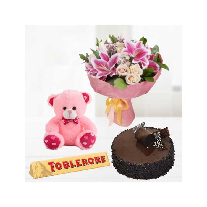 Bunch of exotic mix flowers with 6 inch pink teddybear with toblerone chocolates with chocolate truffle cake