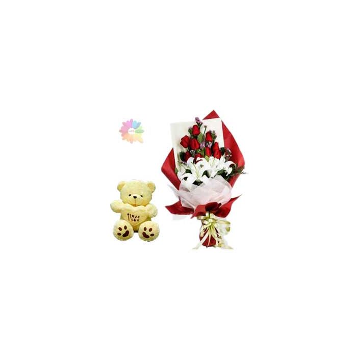 Product Description 1 | Bunch of exotic white lilies with red roses along with 1 feet height teddy bear |
