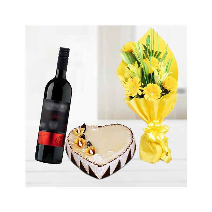 Product Description 5 | bunch of gerberas & lilies with heart shape butterscotch cake with bottle of red wine |