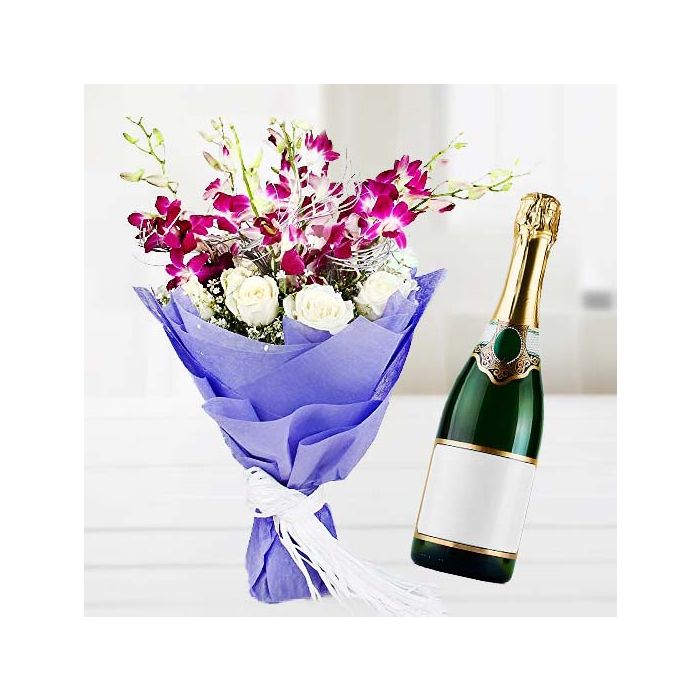 Product Description 5 | Bunch of lavender orchids with white roses with bottle of champegne |
