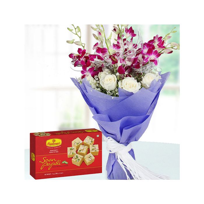 Looking for a luxurious and unique gift that is sure to impress? Look no further than this stunning bunch of lavender orchids with white roses, paired with a box of delicious soan papdi sweets. This sumptuous combination is perfect for treating someone special, and is guaranteed to make a lasting impression.The lavender orchids are expertly crafted and gorgeous to behold, while the white roses add a touch of elegance. The soan papdi sweets are an irresistible treat, and are sure to delight anyone who receives them. This incredible gift is sure to make anyone feel loved, appreciated, and truly special. Order now and make someone's day!