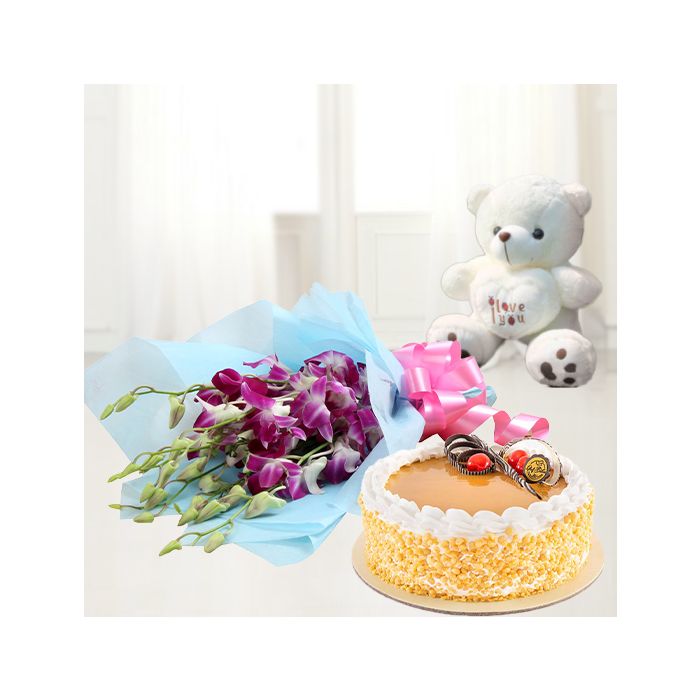 Send your beloved ones this exotic and tantalizing bunch of orchids with fresh cream butterscotch cake. The heavenly creamy cake will make them drool over it and the bunch of orchids will fill their heart with happiness. This is not it, send your love along with this gift as we will be including a cute 6 inch teddy bear with it. They are sure to have a gala time!