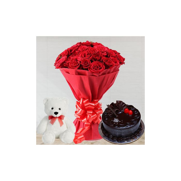 Send your loved ones this special combo of 30 red roses with 1 Pound black Forest cake & teddy bear. It is the perfect way to show your love and appreciation. The cakes are freshly baked and the roses are handpicked to ensure only the best quality for your loved ones. The teddy bear is sure to put a smile on their face. Order now and let them know how much you care!