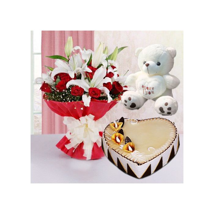 Product Description 5 | bunch of white lilies with red carnations, heart shape butterscotch cake & 6 inch teddy bear |