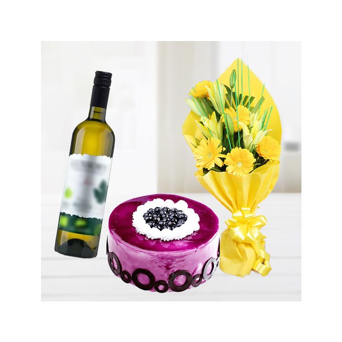 Product Description 5 | Bunch of yellow lilies&gerberas with bottle of white wine with blueberry cake |