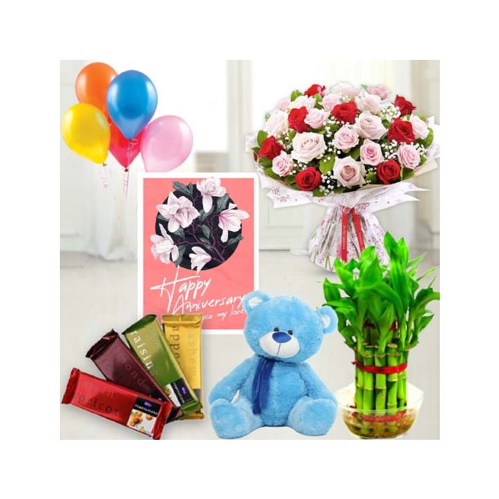 Bunch of 20 red and pink roses, 1 feet height teddy bear, set of 3 bournville chocolates, 2 layer Lucky bamboo plant, 5 blown balloons with anniversary greeting card