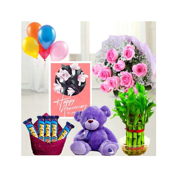 Bunch of 10 pink roses , 6 inch height teddybear, pack of 5 perk chocolates, 2 layer Lucky bamboo plant ,5 blown balloons with anniversary greeting card