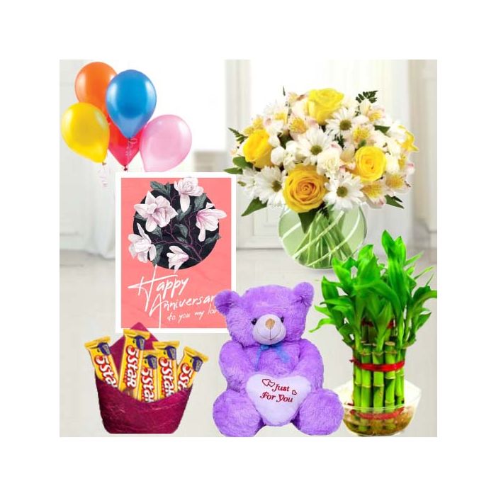 Vase arrangement of roses and daisies, pack of 5 fivestar , 6 inch height teddybear, 2 layer Lucky bamboo plant ,5 blown balloons with anniversary greeting card