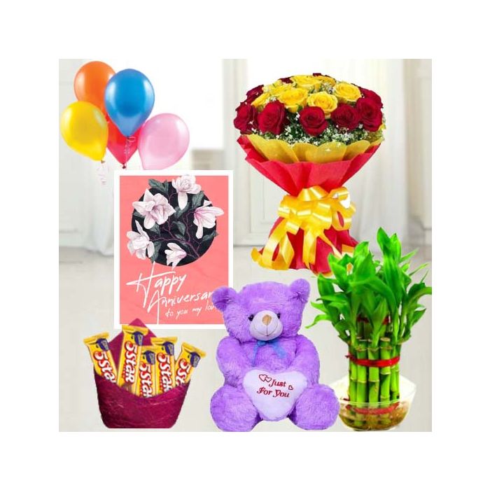 Bunch of 20 red and yellow roses , pack of 5 fivestar , 6 inch height teddybear, 2 layer Lucky bamboo plant ,5 blown balloons with anniversary greeting card