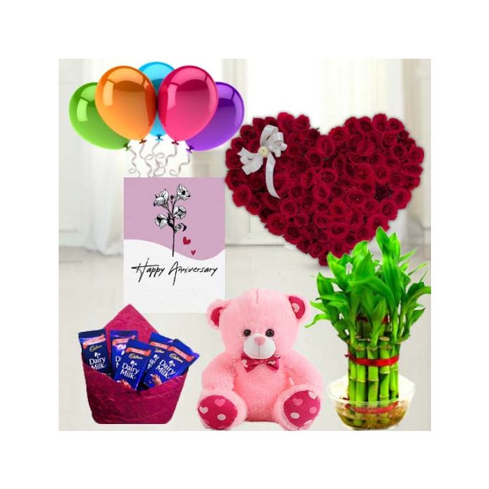 Heart shape arrangement of 50 red roses, pack of 5 dairy milk chocolates, 6 inch height teddybear, 2 layer Lucky bamboo plant ,5 blown balloons with anniversary greeting card