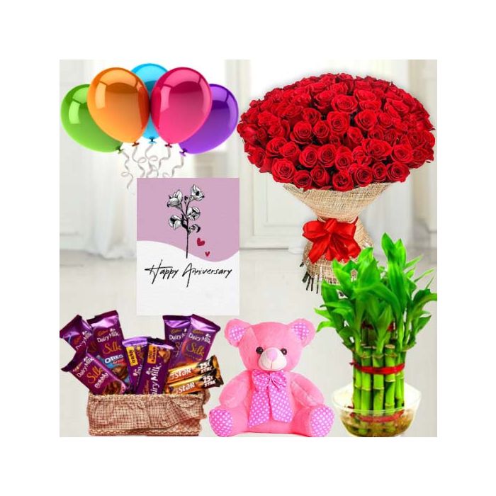 Bunch of 50 red roses, Basket of 7 dairymilk silk, 2 Fivestar, 6 inch height teddybear , 2 layer Lucky bamboo plant ,5 blown balloons with anniversary greeting card